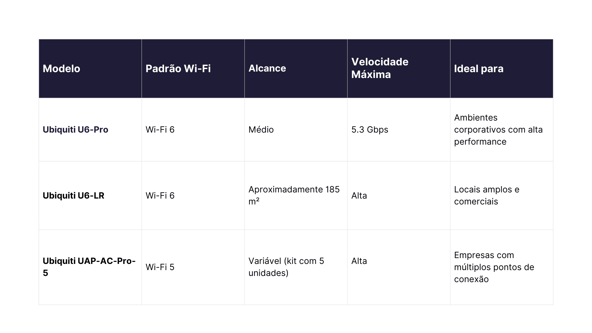 Access points de alto desempenho: desenvolvidos para ambientes corporativos, com maior número de usuários simultâneos e necessidade de estabilidade elevada. Suportam altos níveis de tráfego.