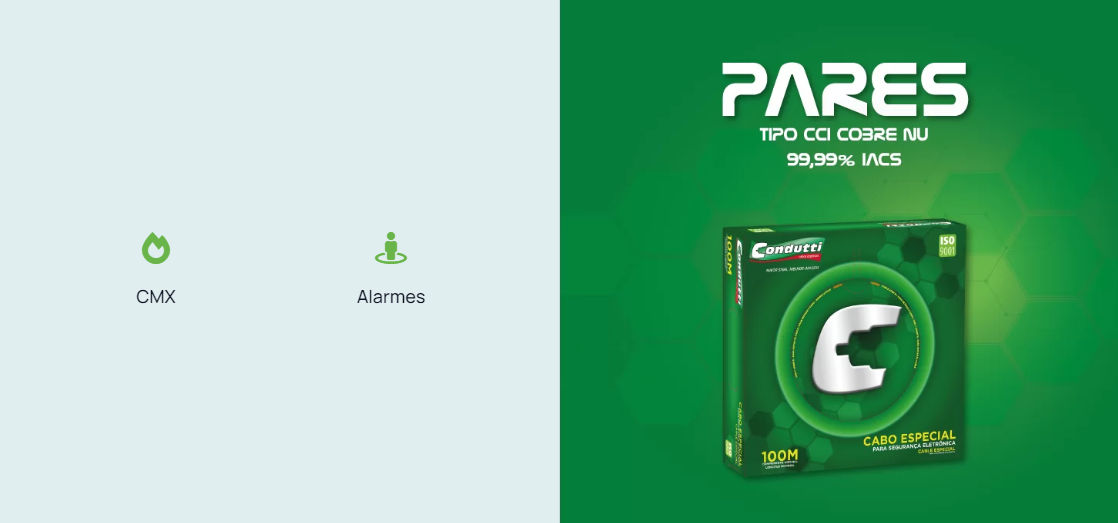 Fabricado com condutores 100% COBRE, os cabos de PAR TIPO CCI Condutti é aplicado em sistemas de alarmes. Os condutores são isolados em PEAD multicores o que garante melhor identificação dos pares no momento da instalação. Capa externa em PVC com componentes Antichama.
