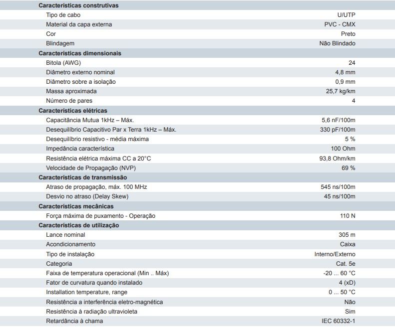 Construção U/UTP De acordo com as mais recentes normas da categoria 5e Suporta aplicações Classe D até 1Gbits