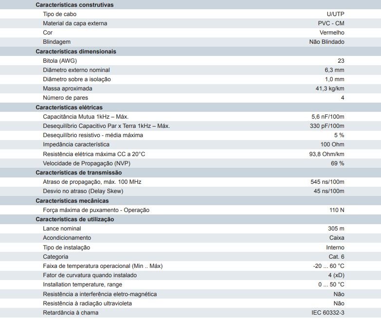 4 pares trançados atendendo ao padrão de cores Azul/Azul Claro, Laranja/ Branco, Verde/Verde Claro, Marrom/Marrom Claro, quanto à isolação dos pares;