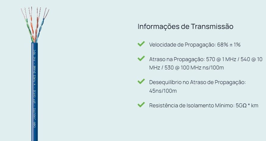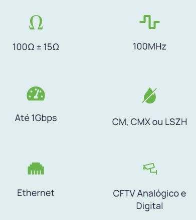 Fabricado com condutores 100% COBRE, isolados em polietileno especial e torcidos dentro dos padrões normativos EIA/TIA 568B.2 o que garante a máxima qualidade para transmissão de dados nas aplicações em Rede Estruturada Horizontal e Vertical compatível com os protocolos Ethernet 100Base-T (100Mbps), GigabitEthernet 1000Base-T (1Gbps). Capa em PVC 70°C anti-chama CMX, CM ou LSZH.