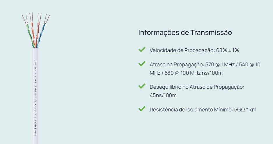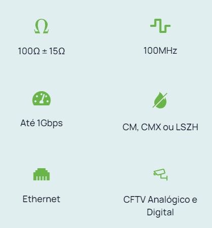 Fabricado com condutores 100% COBRE, isolados em polietileno especial e torcidos dentro dos padrões normativos EIA/TIA 568B.2 o que garante a máxima qualidade para transmissão de dados nas aplicações em Rede Estruturada Horizontal e Vertical compatível com os protocolos Ethernet 100Base-T (100Mbps), GigabitEthernet 1000Base-T (1Gbps). Capa em PVC 70°C anti-chama CMX, CM ou LSZH.