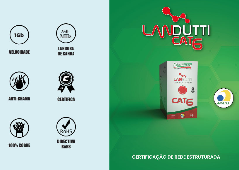 CONDUTTI LANDUTTI – < ANATEL > – CABO U/TP <CLASSE DE CHAMA> CAT 6 23AWG X 4P ANSI/TIA – 568-C 2 & ISO/IEC 11801 ED 2 & IEC 60332 – 1 <LOTE> – <MARCAÇÃO METRICA>