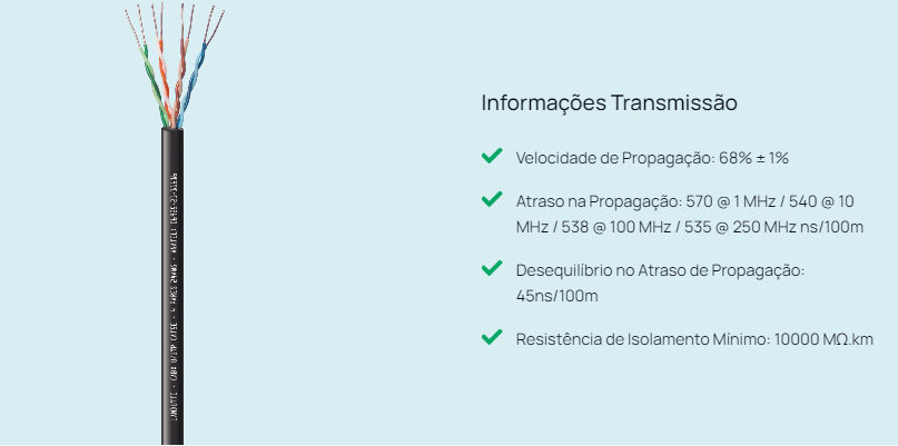 Cabo de Rede U-UTP Cat6 é fabricado com condutores 100% COBRE, isolados com polietileno especial e torcidos dentro dos padrões normativos EIA/TIA 568B.2, EIA/TIA 568C.2 e EIA/TIA 568D.2 o que garante a máxima qualidade para transmissão de dados nas aplicações em Rede Estruturada Horizontal e Vertical compatível com os protocolos Ethernet 100Base-T (100Mbps), GigaEthernet 1000Base-TX (1Gbps). Capa externa em PVC 70oC anti-chama CMX e CM.