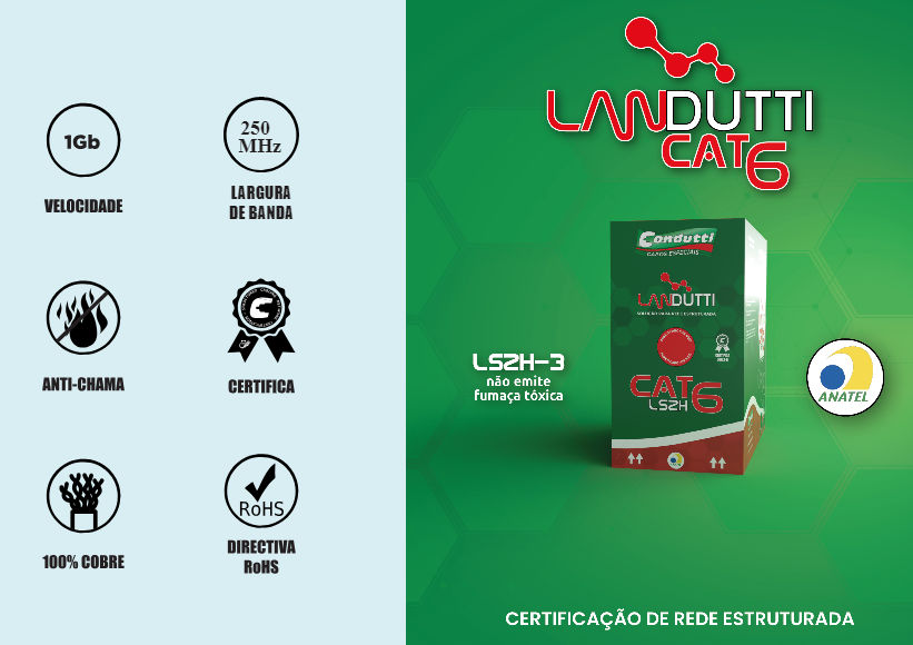 CONDUTTI LANDUTTI – <ANATEL> – CABO U/UTP LSZH-3 CAT 6 24AWG X 4P – ANSI/TIA – 568-C 2 & ISO/IEC 11801 ED 2 & IEC 60332-3-25 – <LOTE> – <ANO> – <MARCAÇÃO METRICA> – <DATA>