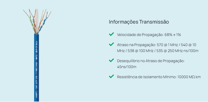 abo de Rede U-UTP Cat6 :SZH é fabricado com condutores 100% COBRE, isolados com polietileno especial e torcidos dentro dos padrões normativos EIA/TIA 568B.2, EIA/TIA 568C.2 e EIA/TIA 568D.2 o que garante a máxima qualidade para transmissão de dados nas aplicações em Rede Estruturada Horizontal e Vertical compatível com os protocolos Ethernet 100Base-T (100Mbps), GigaEthernet 1000Base-TX (1Gbps). Capa externa em PVC 70oC anti-chama LSZH.