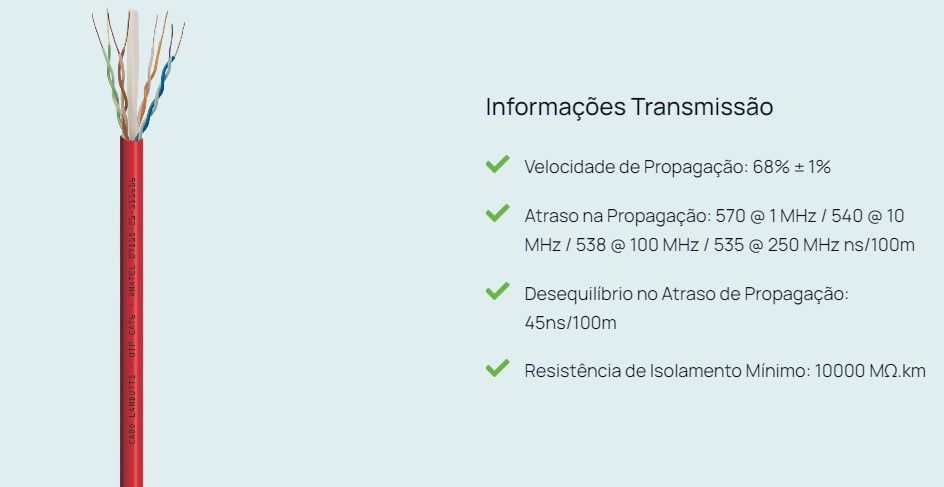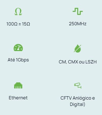 Fabricado com condutores 100% COBRE, isolados com polietileno especial e torcidos dentro dos padrões normativos EIA/TIA 568B.2 e EIA/TIA 568C.2 o que garante a máxima qualidade para transmissão de dados nas aplicações em Rede Estruturada Horizontal e Vertical compatível com os protocolos Ethernet 100Base-T (100Mbps), GigaEthernet 1000Base-TX (1Gbps). Capa externa em PVC 70oC anti-chama CMX, CM ou LSZH.