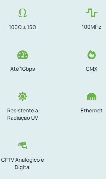 Fabricado com condutores 100% COBRE, Landutti U-UTP Cat5e Dupla Capa Externo é isolados em polietileno especial e torcidos dentro dos padrões normativos EIA/TIA 568B.2 o que garante a máxima qualidade para transmissão de dados nas aplicações em Rede Estruturada Horizontal e Vertical compatível com os protocolos Ethernet 100Base-T (100Mbps), GigabitEthernet 1000Base-T (1Gbps). Capa em PVC 70°C anti-chama CMX e Segunda capa em PEDB Preto resistente a radiação UV