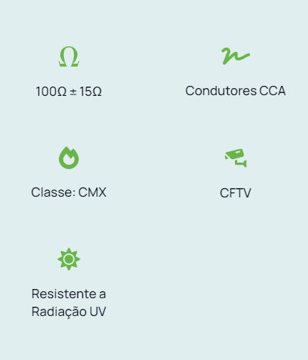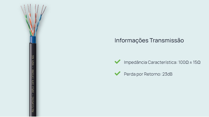 O Cabo CFTV Multicâmeras Dupla Capa apresenta uma solução perfeita em custo-benefício para aplicações em CFTV analógico HD utilizando pares trançados, onde requer o uso de Video Balun. Instale em Residências ou pequenos comércios em aplicações externa. Condutores em alumínio cobreado torcidos par a par e isolados com polietileno de alta densidade, capa em PVC 75°C com componentes anti-chama CLASSE CMX e segunda capa em PEBD Preto resistente a radiação UV ideal para aplicações Externa.
