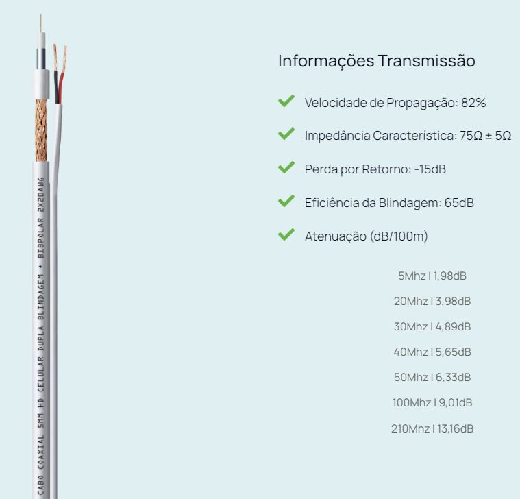 O condutor central de 0,64mm em 100% Cobre solido juntamente com a formação do coaxial atende para conectores de compressão 5.1 garantindo ausência de falhas na conexão.