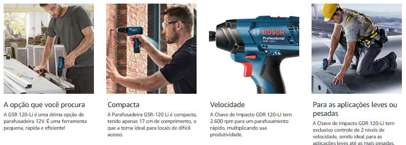 O Combo Bosch 12V com 1 Chave de Impacto GDR 120-LI + 1 Parafusadeira GSR 120-LI, com 2 baterias 12V de 2,0Ah, 1 carregador rápido BIVOLT, garante alta performance nas aplicações devido ao alto torque e máxima autonomia das baterias. Além disso, as ferramentas são 100% compatíveis com baterias e carregadores 12V da Bosch.