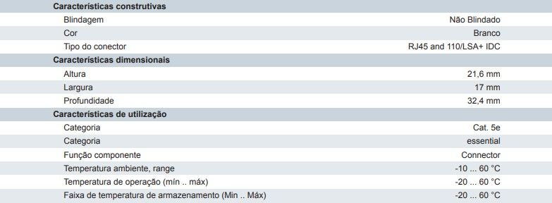 A linha de conectores ESSENTIAL-5e é a oferta de largura de banda de 100MHz para as aplicações classe D até 1Gbits. Conector padrão Nexans utilizado para conexões em salas de telecomunicações e área de trabalho. Fabricados e testados com a mais recente especificação da Categoria 5e. Suporta aplicações Fast Ethernet 100BASE-TX, Gigabit Ethernet 1000BASE-T. Compatível com toda a linha Essential de patch cords, patch panel, espelhos, cabos e outros acessórios Nexans.