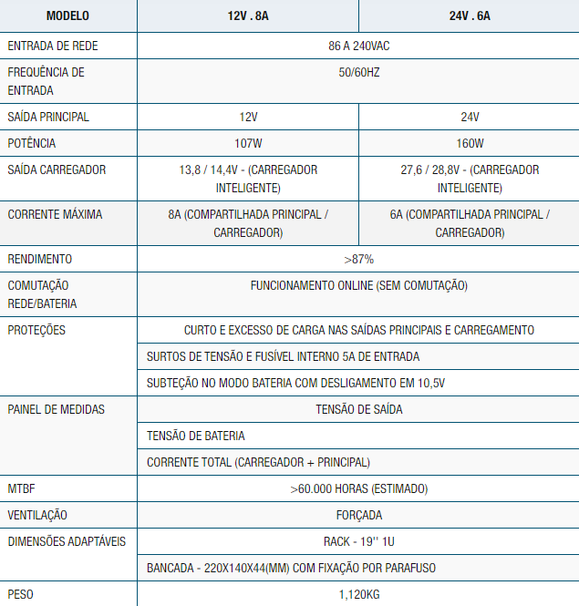 Elas podem ser encontradas nas tensões: 12V 8A e 24V 6A. Confira as características técnicas na tabela no final da página.