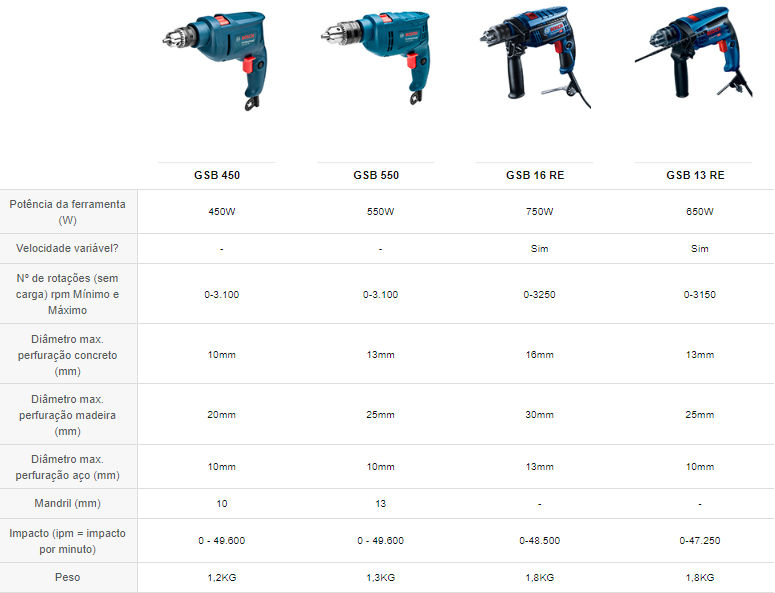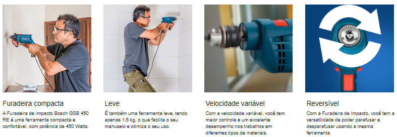 A Furadeira de Impacto GSB 450 RE tem potência de 450 Watts, é confortável, pesa apenas 1,6 kg e pode ser usada para perfurar alvenaria, madeira e metal, nas opções com ou sem impacto, graças ao botão comutador. Você ainda pode fazer parafusamentos por meio da função de reversão. Com o botão trava, você também pode usar esta ferramenta para os trabalhos contínuos.