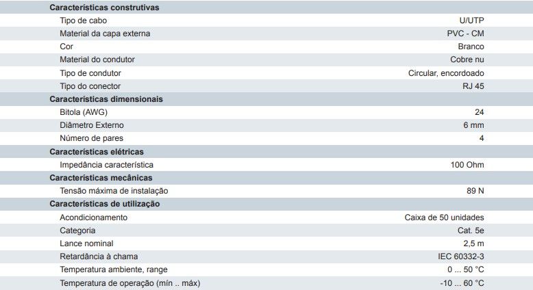 Sobre o núcleo é aplicada uma capa de material retardante a chama. Nas pontas são aplicados conectores de 8 vias do tipo RJ45.