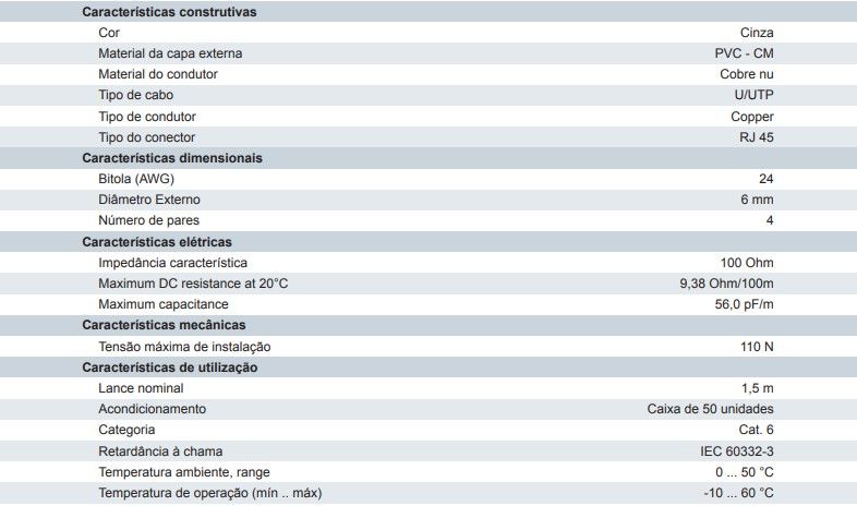 Uma camada de material retardador de chama é aplicada sobre o núcleo. Conectores tipo RJ45 de 8 vias são aplicados nas pontas.