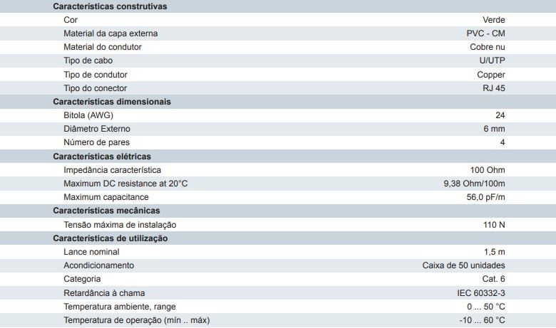 Patch Cord CAT.6 Suporta Classe E, largura de banda até 250 MHz Boot injetado Em conformidade com as mais recentes normas para Cat.6