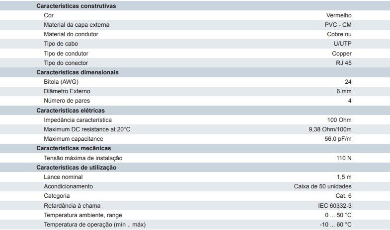 Patch Cord CAT.6 Suporta Classe E, largura de banda até 250 MHz Boot injetado Em conformidade com as mais recentes normas para Cat.6