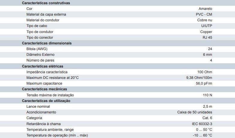 Sobre o núcleo é aplicada uma capa de material retardante a chama. Nas pontas são aplicados conectores de 8 vias do tipo RJ45.