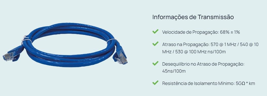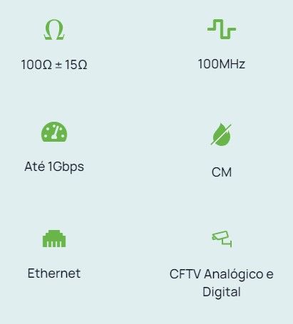 Fabricado com condutores 100% COBRE flexível isolados em polietileno especial e torcidos dentro dos padrões normativos o que traz a máxima qualidade para transmissão nas aplicações FastEthernet 100Base-TX, GigabitEthernet 1000Base-T, ATM622.