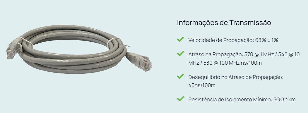 Fabricado com condutores 100% COBRE flexível isolados em polietileno especial e torcidos dentro dos padrões normativos o que traz a máxima qualidade para transmissão nas aplicações FastEthernet 100Base-TX, GigabitEthernet 1000Base-T, ATM622.
