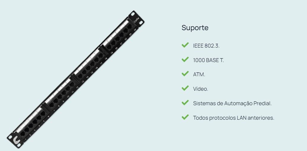 Aplicado em Sistema de Cabeamento Estruturado Horizontal ou Vertical sendo para trafego de voz, dados e imagens até 1GigaBit Ethernet (1000 Mbps), atendendo aos requisitos da Norma TIA/EIA 568B.2.