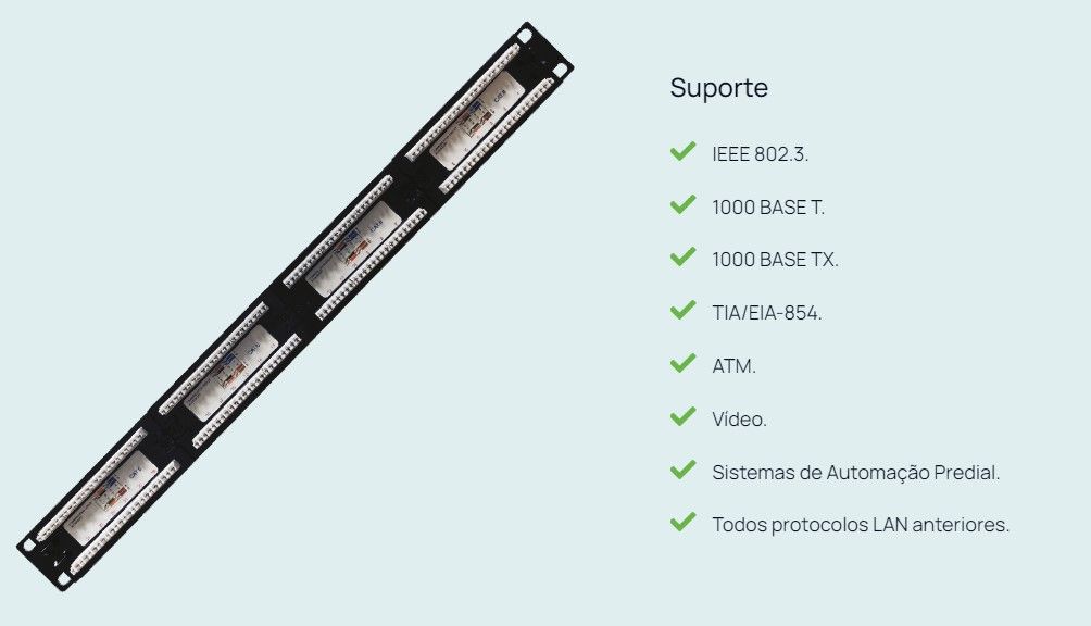 Aplicado em Sistema de Cabeamento Estruturado Horizontal ou Vertical sendo para trafego de voz, dados e imagens até 1GigaBit Ethernet (1000 Mbps), atendendo aos requisitos da Norma ANSI/TIA/EIA-568C-2.1 (Balanced Twisted Pair Cabling Components).