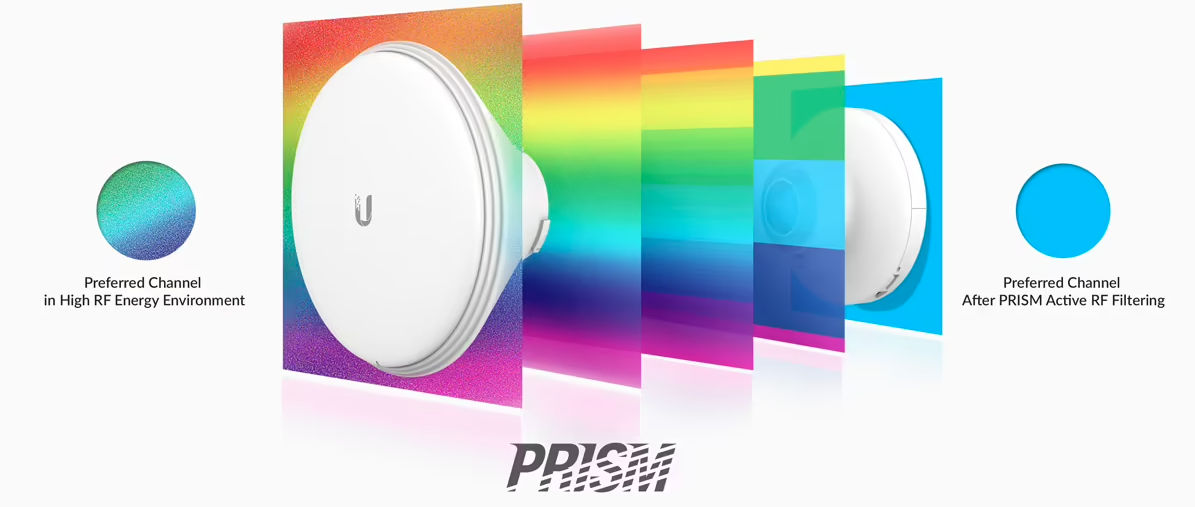 A equipe de P&D da Ubiquiti projetou a filtragem de airPrism como uma solução robusta para interferência de colocalização de torre. Sem necessidade de comunicação entre rádios - e funcionando apesar do ruído de rádios de outros fornecedores (ao contrário da sincronização GPS) - o airPrism permite maior capacidade do sistema e rendimento geral, reduzindo ainda mais a energia fora de banda.