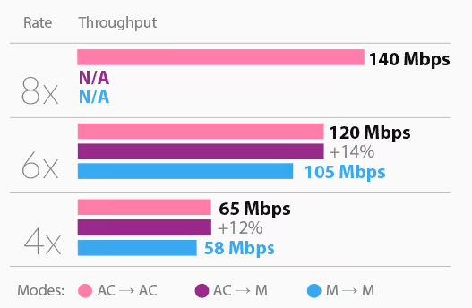 Alta Eficiência MAC fornece taxa de transferência de ± 80% PHY RATE.