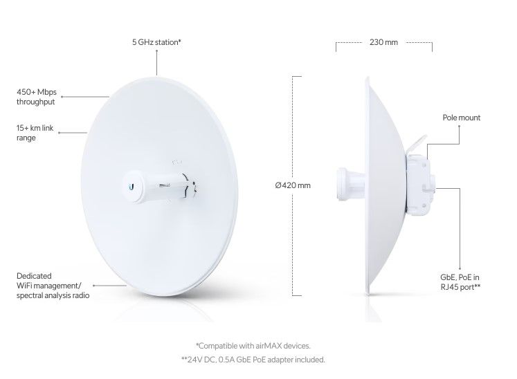 Ponte ponto a ponto (PtP) de 5 GHz de alto desempenho com refletor de antena integrado. Fornece taxa de transferência de dados de até 450+ Mbps.