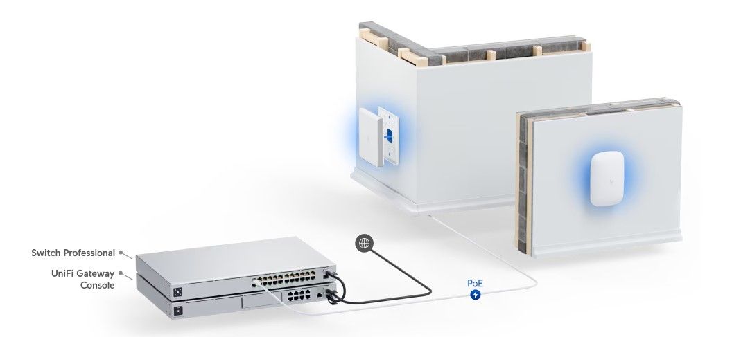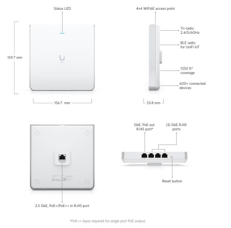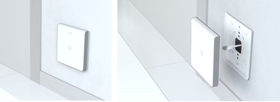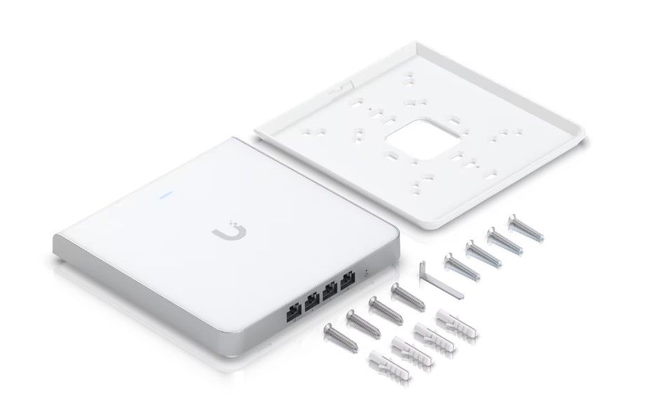 Elegante ponto de acesso WiFi 6E montado na parede com um switch integrado de quatro portas projetado para redes de escritório de alta densidade.
